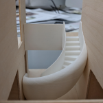 “Our duplex apartment renovation started from the owners’ desire to reconfigure the staircase at the center of their home,” says Alex, “Using our in house 3D printer and a scale wood model of the space, we mocked up countless iterations before settling on a soft, sculptural curved staircase, bound by the double-height walls on either side and swooping out into the space. We’re so excited to finally see it taking shape on site – moving from our screens, to the model, to shop drawings, and finally to raw steel being hoisted into space.”